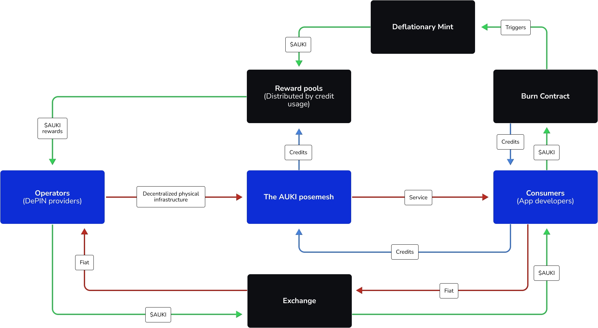 Para que el consumidor pueda comprar servicios del posemesh, primero debe enviar una cantidad adecuada de tokens $AUKI, denominados en dólares, a un contrato de quema. A cambio, el consumidor recibirá un saldo de crédito "offchain" con el posemesh, que representa un reclamo sobre servicios precomprados. Estos créditos son intransferibles y pueden ser consumidos por los participantes de la organización con el tiempo.