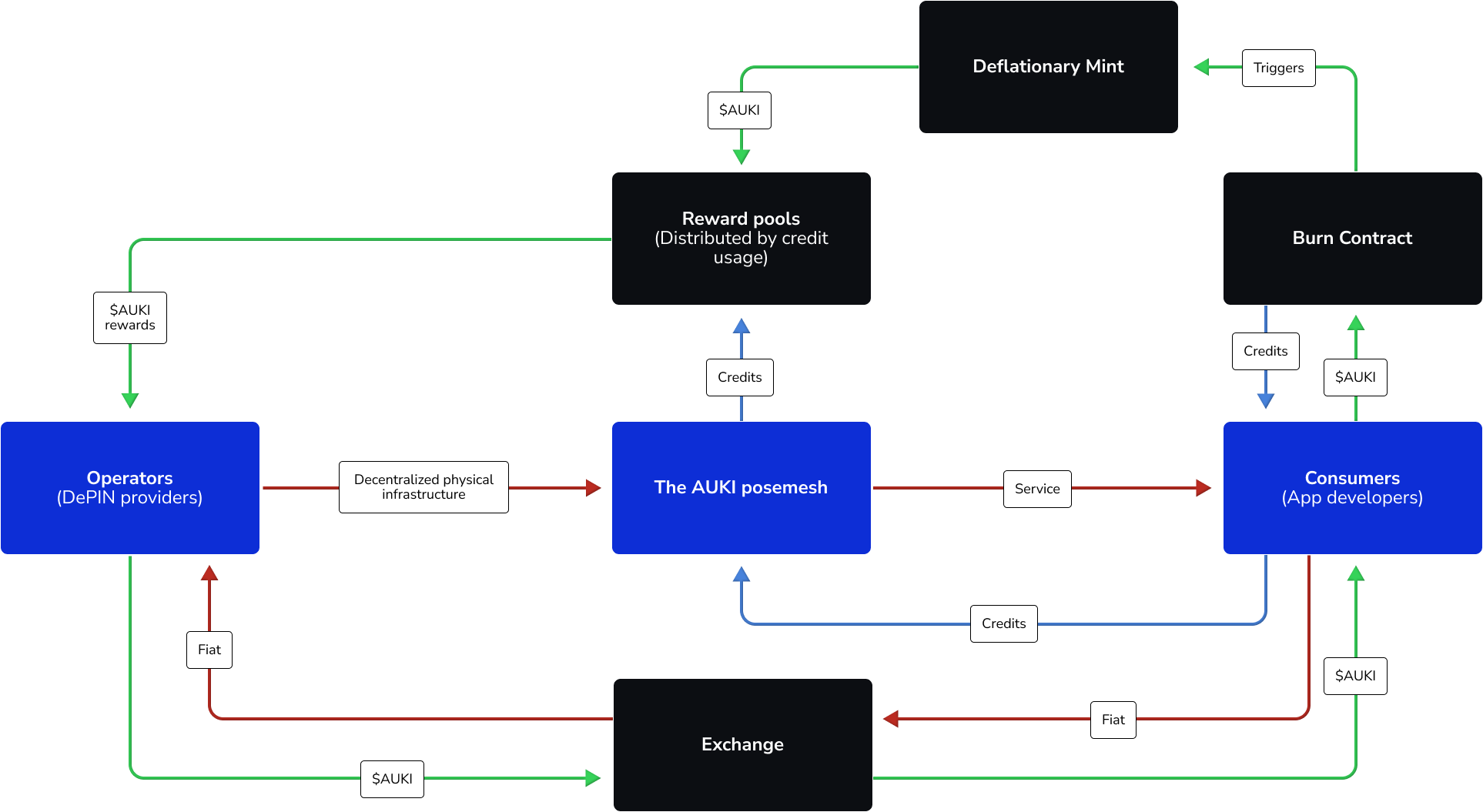 AUKI posemesh ekonomisinde, arz tarafındaki sağlayıcılar (operatörler) katılım ödülleri ve performans ödülleri karşılığında kaynaklarının bir kısmını ağın kullanımına sunar. Ağ da bu kaynakları talep tarafı katılımcılarına (tüketiciler), tipik olarak uygulama veya donanım geliştiricilerine bir hizmet sağlamak için kullanabilir.